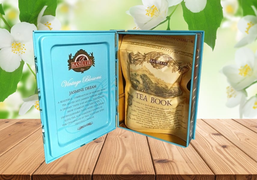 ヌワラエリヤ茶葉とジャスミンの花の美しい組み合わせお茶のシャンパンとも呼ばれるヌワラエリヤ茶は、軽やかな絶妙な味わいと優しい花の香りが特徴のセイロン茶です。ヌワラエリヤの繊細でありながら際立った味わいと、上品に香るジャスミンを組み合わせています。この美しいBOOK型デザインの缶は読書のような静かな時間に香り高く寄り添い、エレガントなティータイムへと導きます。
